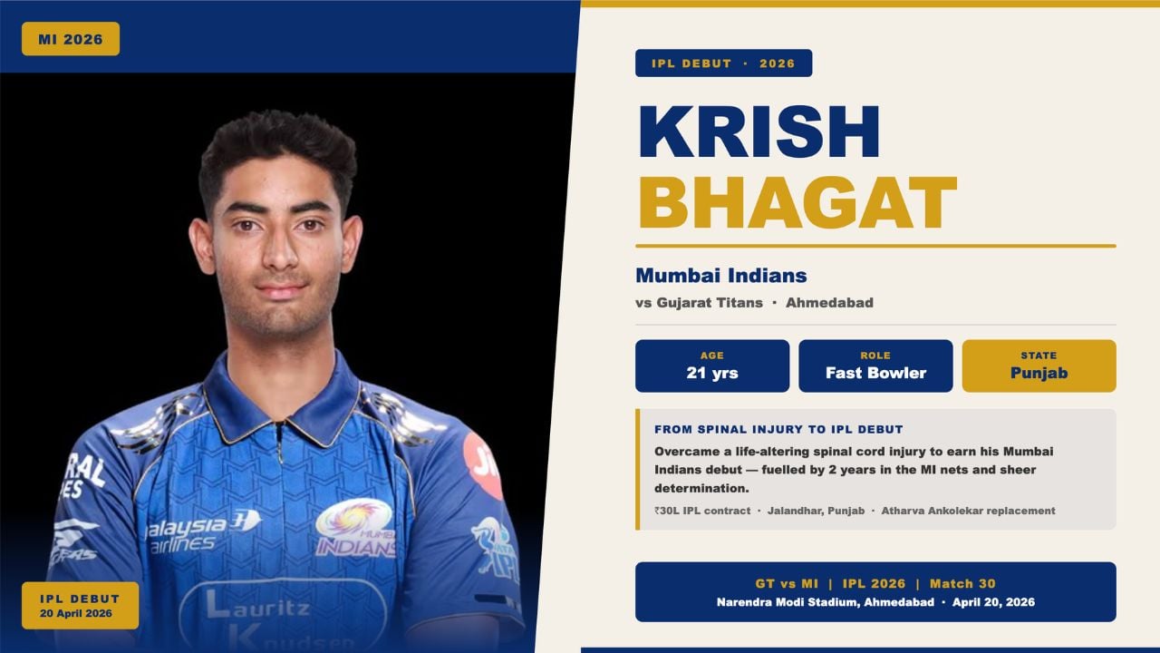 When the Mumbai Indians named their playing XI for Match 30 of IPL 2026 against the Gujarat Titans at the Narendra Modi Stadium in Ahmedabad, one name stood out among the debutants: Krish Bhagat. The 21-year-old right-arm fast bowler from Jalandhar, Punjab, is not just a cricketer making his IPL debut. He is a young man who stared down a life-altering spinal cord injury early in his career and came back stronger, more determined, and ultimately good enough to earn a place in one of cricket’s most celebrated franchises. This is his story.