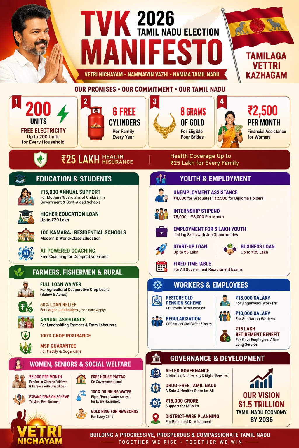 The manifesto proposes Rs 2,500 per month to women, which will be given directly to women heads of households. Additionally, the party has pledged to provide 8 grams of gold for poor brides as part of its marriage assistance scheme. The TVK also plans to waive agricultural cooperative crop loans for farmers holding under five acres of land and provide financial assistance to farm laborers.
